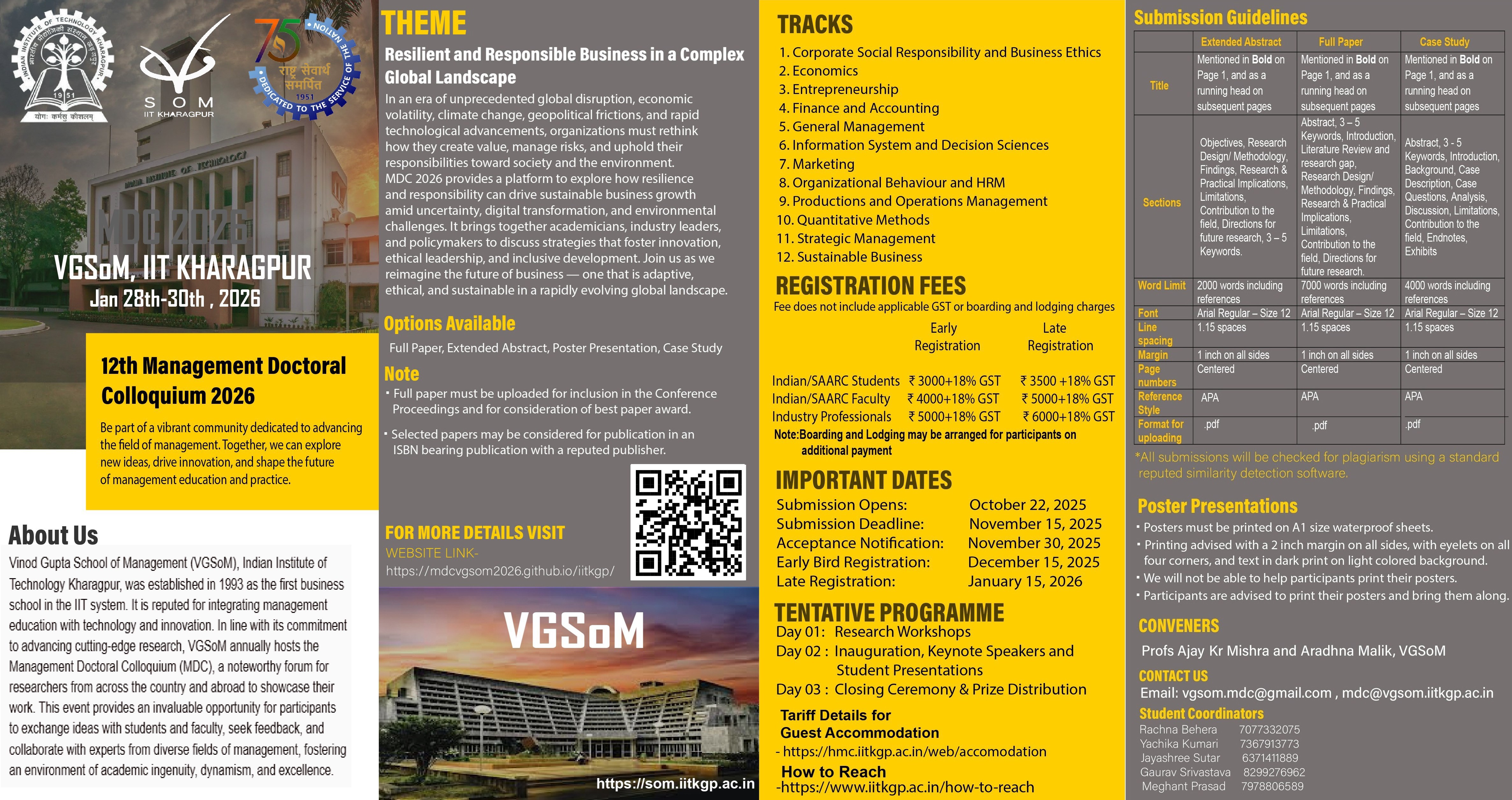 Vinod Gupta School of Management (VGSoM), Indian Institute of Technology Kharagpur, was established in 1993 as the first business school to be set up in the IIT system. It is reputed for integrating management education with technology and innovation. In line with its commitment to advancing cutting-edge research, VGSoM annually hosts the Management Doctoral Colloquium, which serves as a noteworthy forum for researchers across the country and abroad to showcase their work. This event provides an invaluable opportunity for participants to exchange ideas with students and faculty, and seek feedback from and collaborate with experts in a diversity of fields related to management, further spawning an environment of academic ingenuity, dynamism, and excellence.